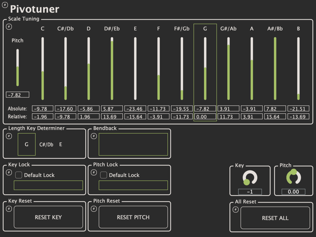 Sometimes microtonal modulation is undesirable; sometimes we want to stick to a single key, or a single pitch center. Pivotuner can lock keys (which prevents microtonal modulation and enables unusual sonorities; tuning a F major triad to the key of D sounds quite interesting), and the pitch (which prevents microtonal modulation while still allowing chord tuning to shift)!